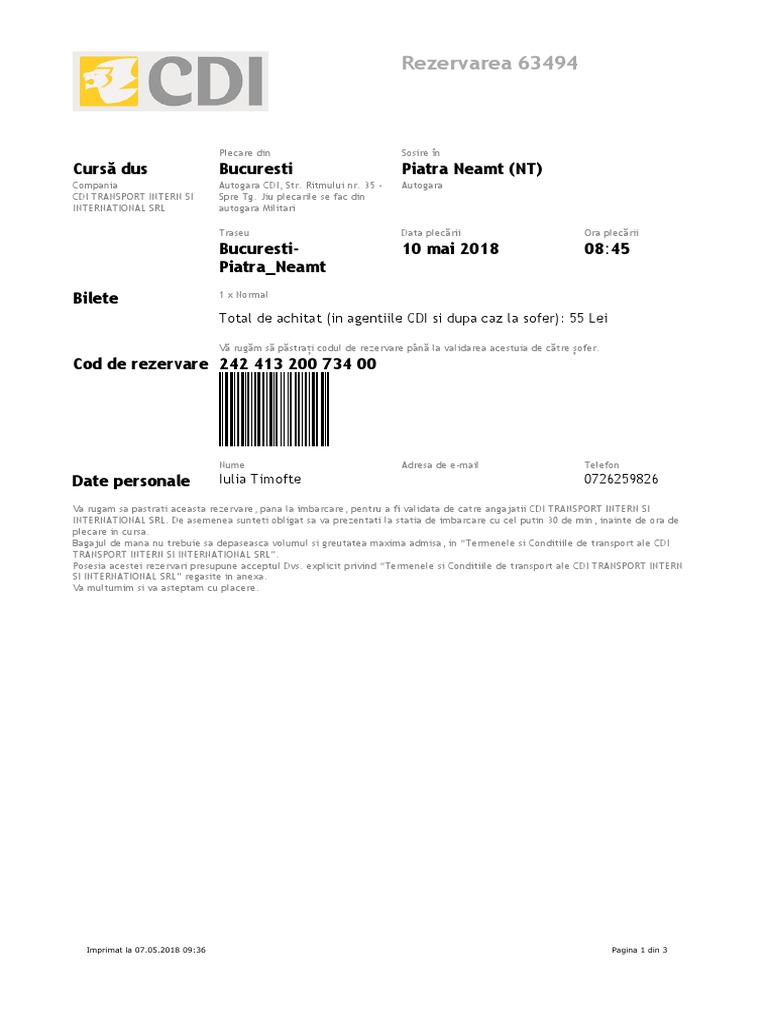Rezervarea 63494 Cursă Dus Bucuresti Piatra Neamt Nt