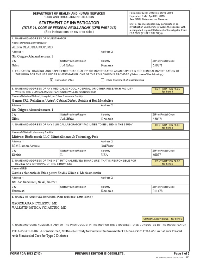 Fda 1572 Institutional Review Board Health Sciences
